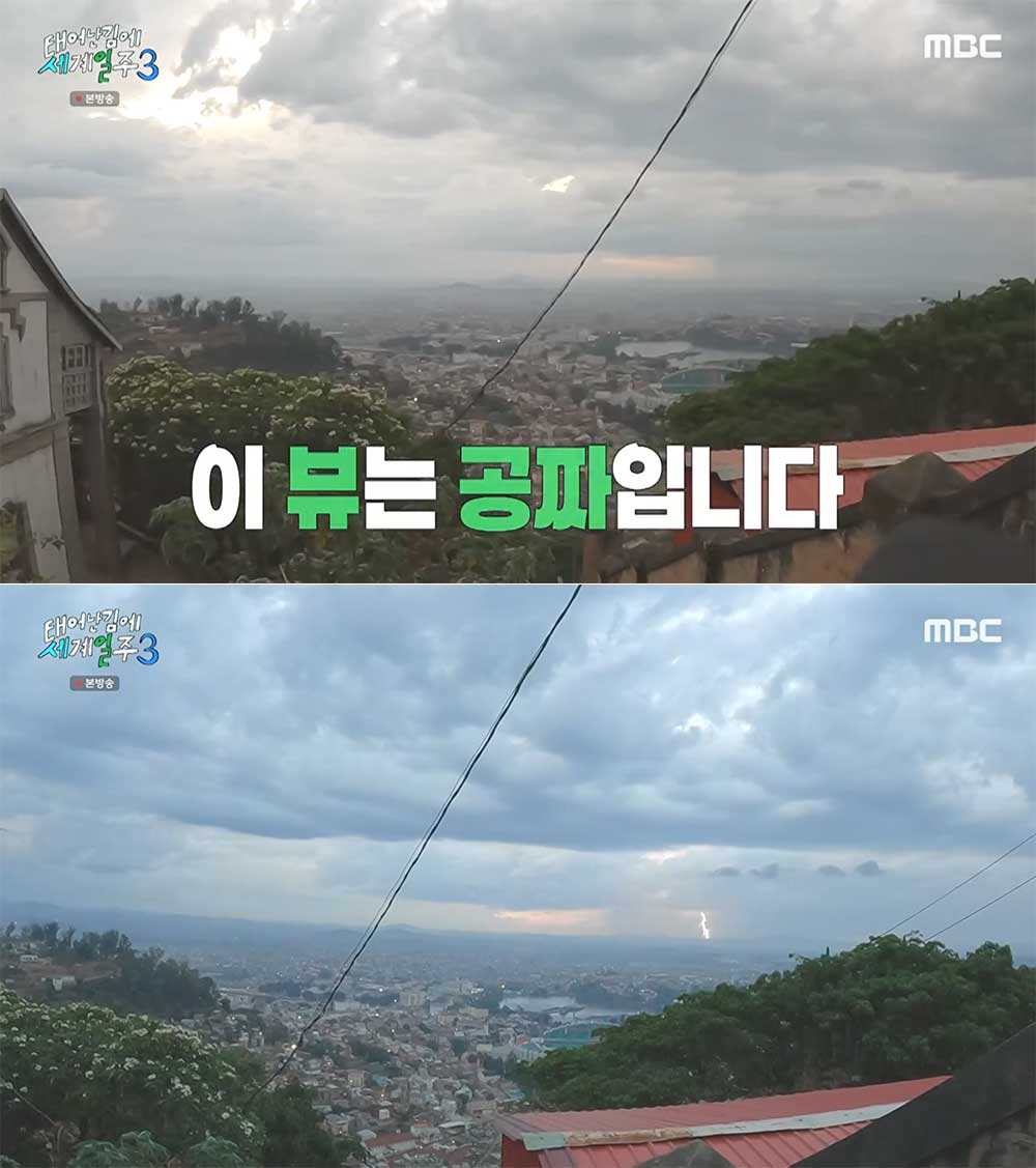 기안84가 있는 곳은 비가 안 오지만, 저 멀리 서는 비가 오고 번개가 친다.