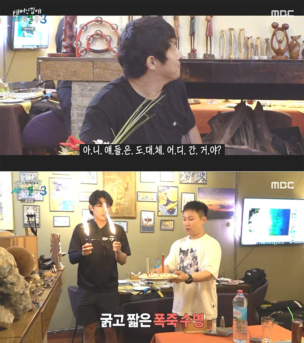 그 위에 초 대신 폭죽으로 꾸미던 중, 덱스가 도착을 한다.