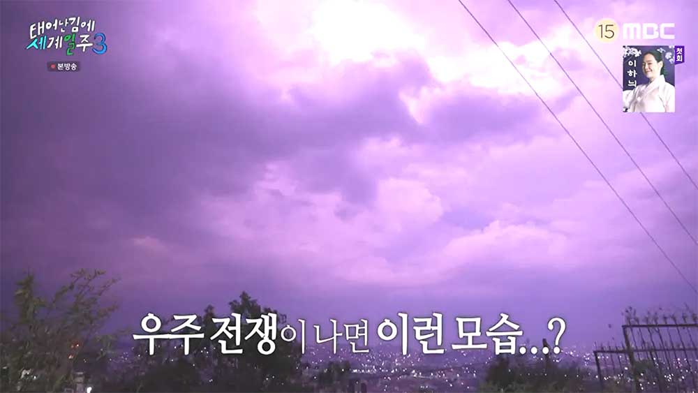 기안84가 있는 곳은 비가 안 오지만, 저 멀리 서는 비가 오고 번개가 친다.