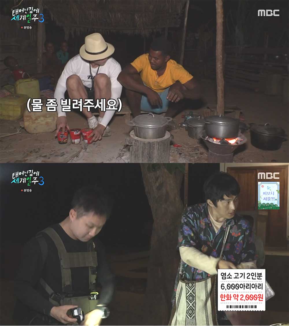 기안84와 빠니보틀은 식료품 판매하는 곳에서 염소 고기와 물 그리고 맥주를 구매한다.
