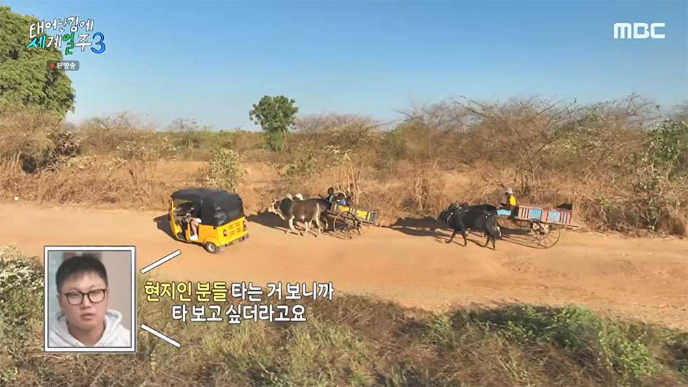 걸어가며 보는 풍경을 감상하고 덱스와 빠니보틀은 소수레를 탄다.