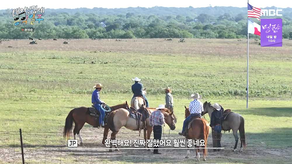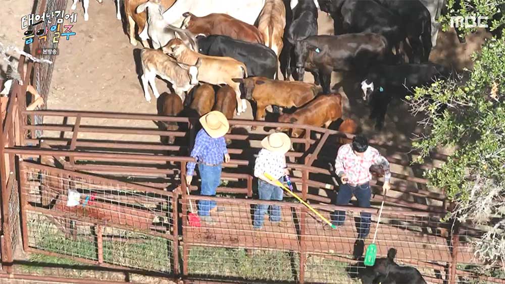 간단한 목장 투어를 마치고 각자에게 말을 한 마리씩 쥐어 준다. 탑승 법에 대해 간단히 전달해 주었는데 유태오는 처음 하는 승마임에도 실력이 출중하다 보니 품종 좋은 말을 추천해 주어서 말을 타고 소몰이를 한다. 축구 경기처럼 좌우에서 몰고 가운데서 몰며 원하는 위치로 소들을 이동시킨다.
