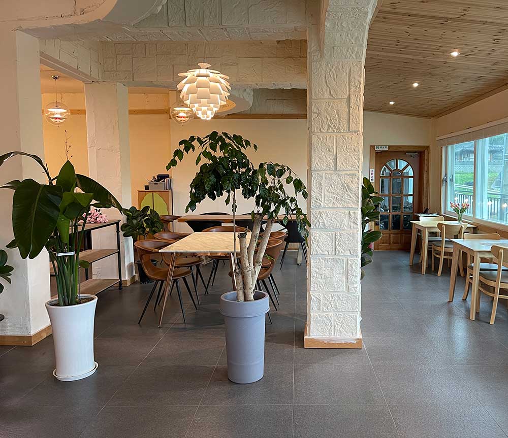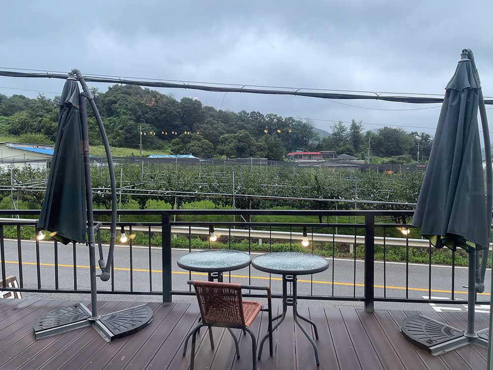 창 밖에 보이는 풍경은 당장이라도 비가 내릴 것 같은 구름과 가을에 결실을 맺을 과수들이 한눈에 들어온다. 하지만 매장 안은 에어컨으로 쾌적한 상태라서 습도를 전혀 느낄 수 없었다. 이곳에서 가끔씩 지나다니는 자동차를 보고 계절 별로 달라지는 풍경을 바라본다면 마음이 건강 해 질 것 같다.