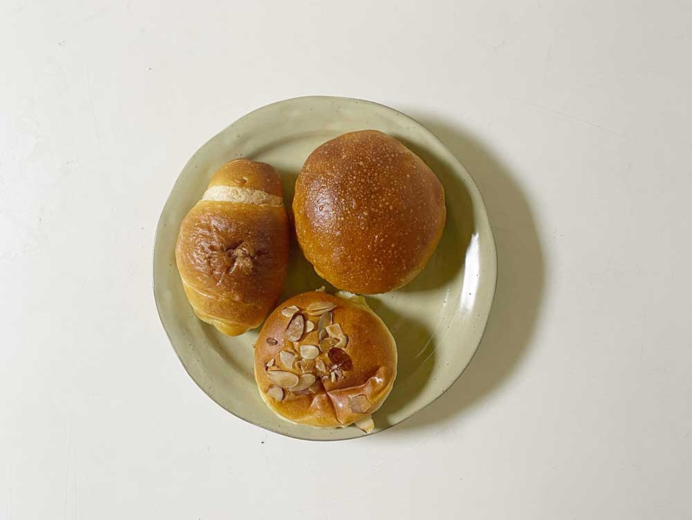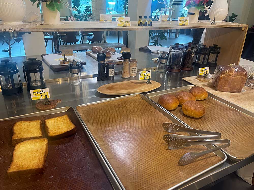반대편 진열대를 보니 연유 토스트 (2,500원)과 번 (3,000원) 그리고 쌀식빵 (7,500원)이 보여 하나씩 담기로 했다.