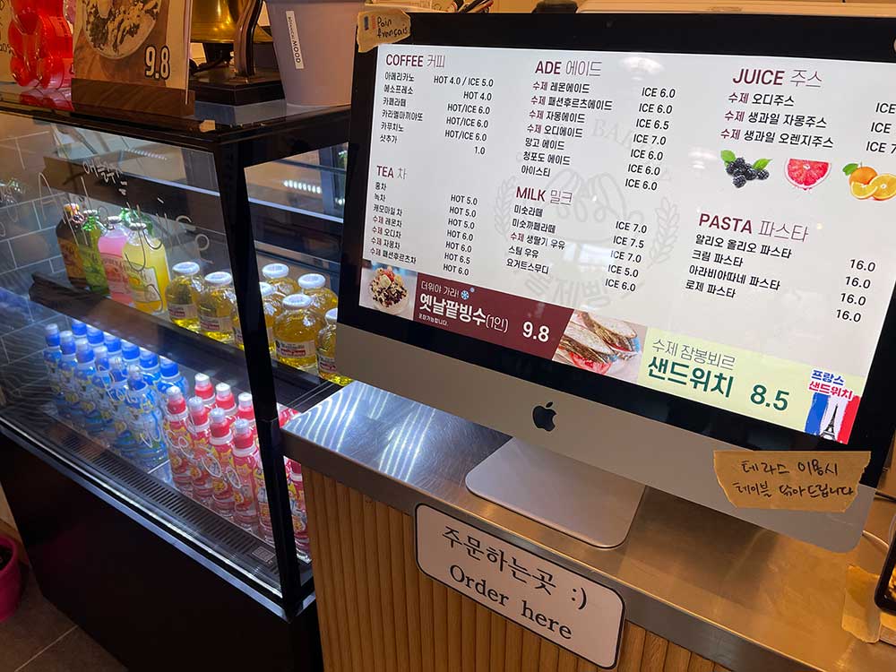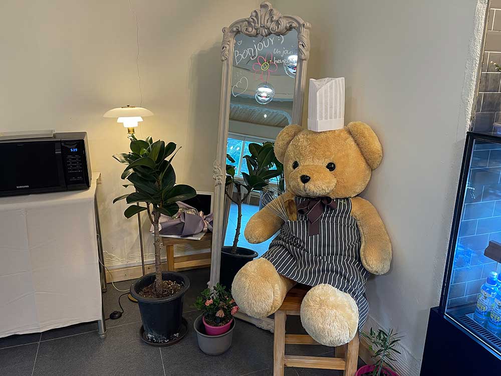 계산대 옆엔 전자레인지와 거울이 보인다. 프랑스에서 유학하신 분답게 프랑스어인 Bonjour (봉쥬르)가 적혀 있었다. 입구에서 봤던 곰과 커플인지 모르겠지만 비슷한 사이즈의 갈색곰이 의자 한 곳을 차지하고 있었다.