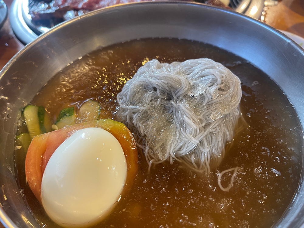 함흥 물냉면 9,000원. 냉면 육수 안에 토마토가 들어간 것이 특이했다. 토마토가 맛없는 게 아니라 냉면에서 토마토를 볼 줄 몰랐기 때문에 신기했다.