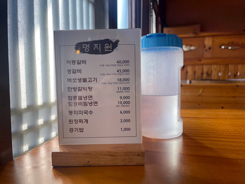 식사 시간이 조금 지난 후라 앉을자리가 넉넉했다. 날이 더워서 창문을 열 수는 없지만 등받이가 있는 좌석임과 동시에 창가에 자리를 잡았다. 이동갈비가 메인 메뉴이지만 생갈비, 버섯생불고기, 한방 갈비탕, 함흥물냉면, 함흥비빔냉면, 동치미국수, 된장찌개, 공깃밥이 메뉴판에 있었다.