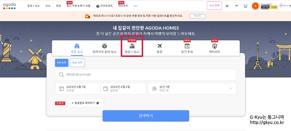 아고다에 접속하면, 항공+숙소에 큰 할인이라는