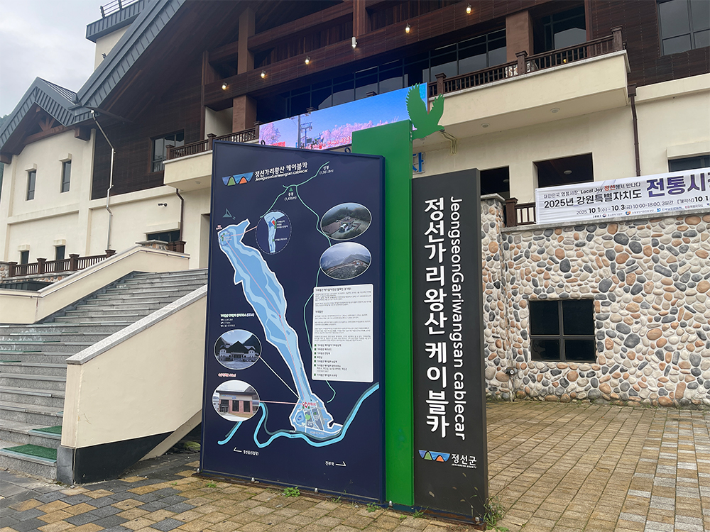 계단 왼편엔 정선 관광 안내판이 있으며 안내판 왼쪽에 보이는 레드 카펫을 따라가면 엘리베이터를 탑승해서 건물 내부로 들어갈 수 있다.