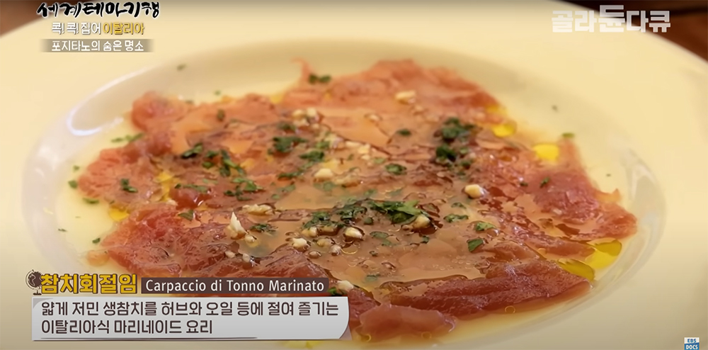 얇게 저민 생참치를 허브와 오일 등에 절여 즐기는 이탈리아식 마리네이드 요리.