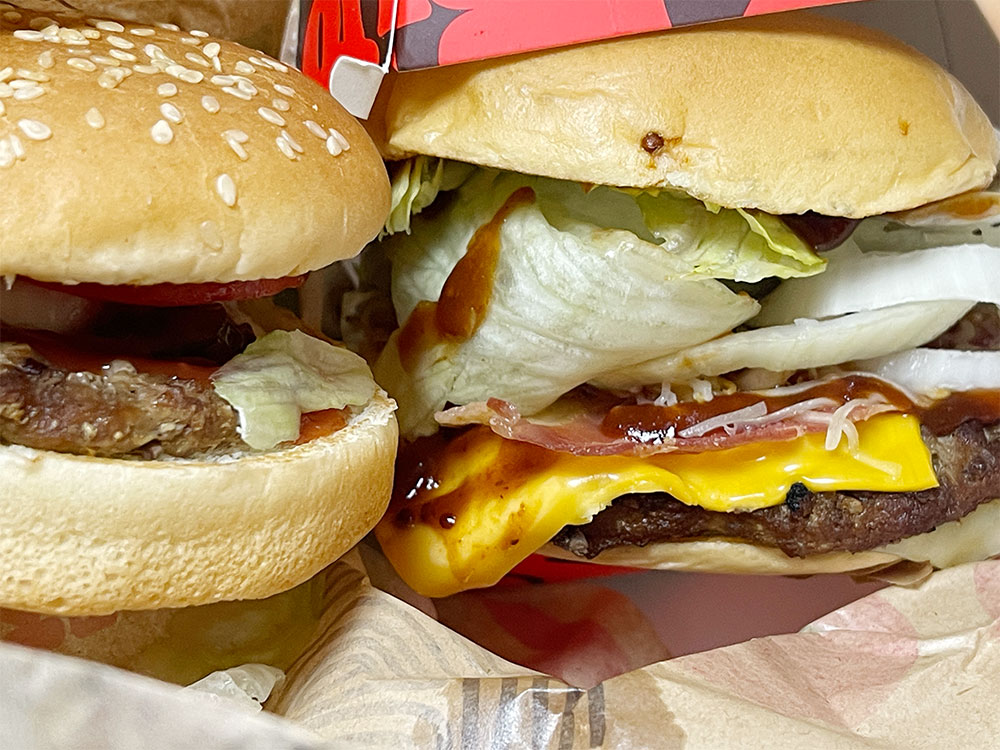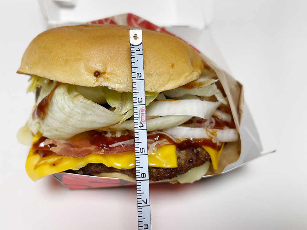 언뜻 보면 두께 차이는 크지 않아 보이지만 와퍼 주니어를 오리지널스 뉴욕 스테이크와 비교하니 고속도로 휴게소에서 파는 부실한 햄버거처럼 보인다.