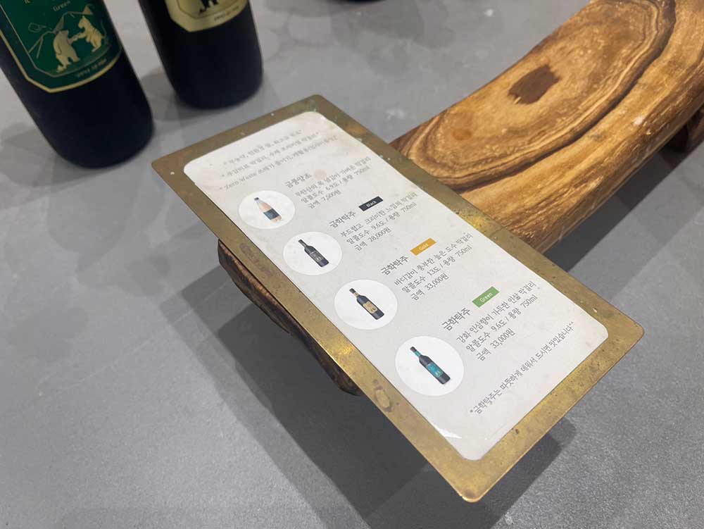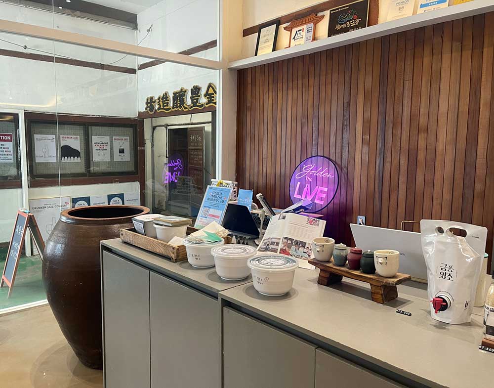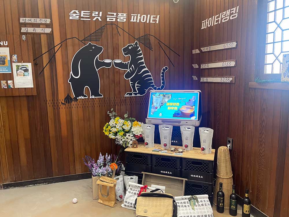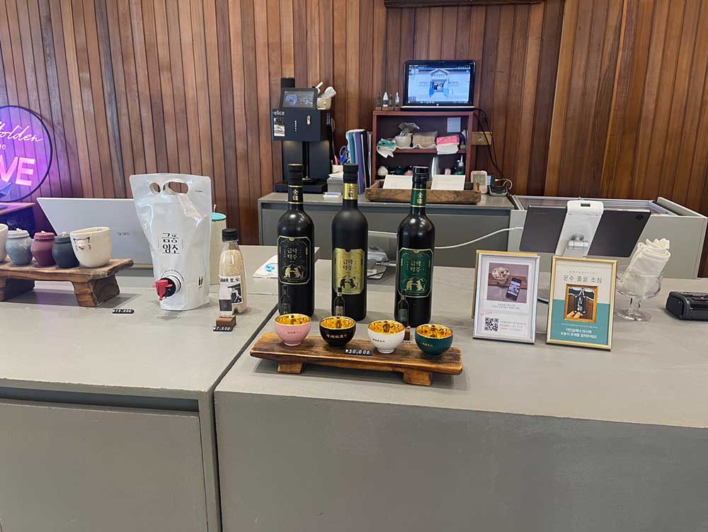과거와 현대를 공존하는 듯한 인테리어. 카운터에는 금풍양조장의 굿즈와 술이 전시되어 있었다.