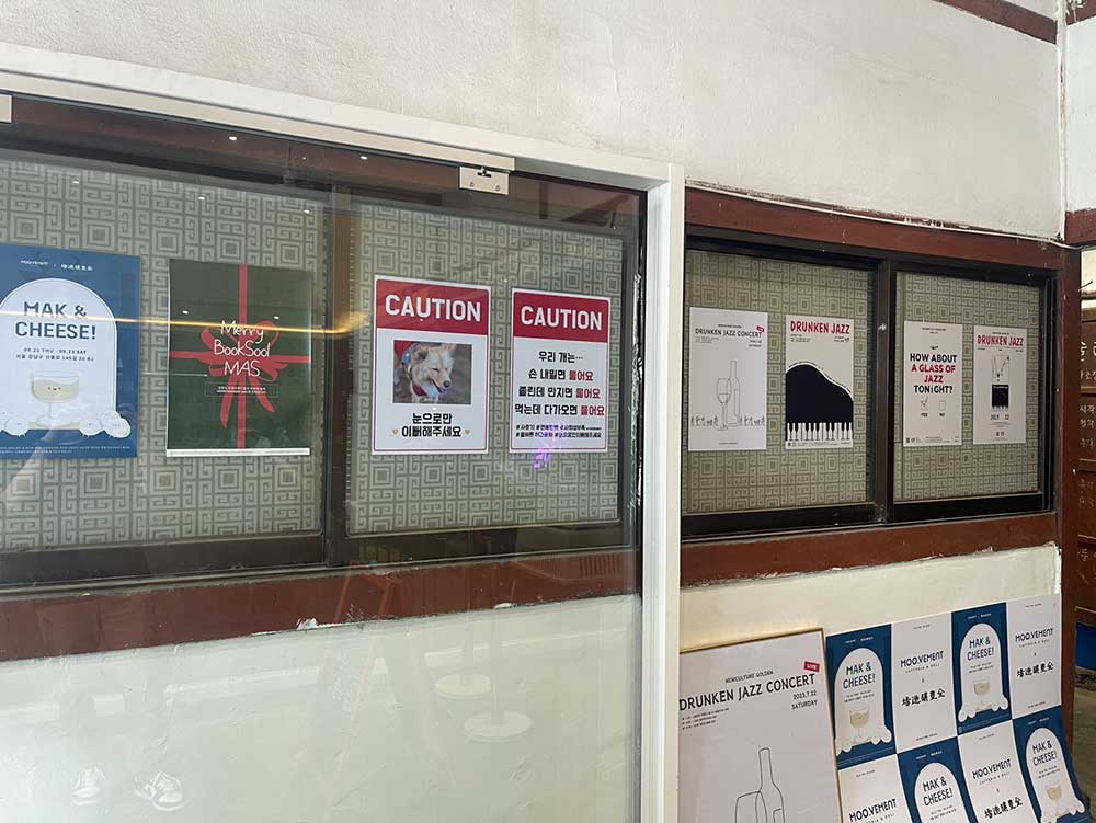 그동안 했던 음악 행사와 애완견에 대한 경고이자 안내문이 함께 붙어있다. 우리 개는 안 물어요라고 하는 견주들이 많았는데, 손 내밀면 물고, 졸린데 만지면 물고, 먹는데 다가오면 문다고 알려주고 있다.